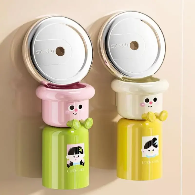 Cartoon Magnetic Toothbrush Holder Punch-Free Upside down Wall Mounted Bathroom Storage Rack Gargle Cup Organizer
