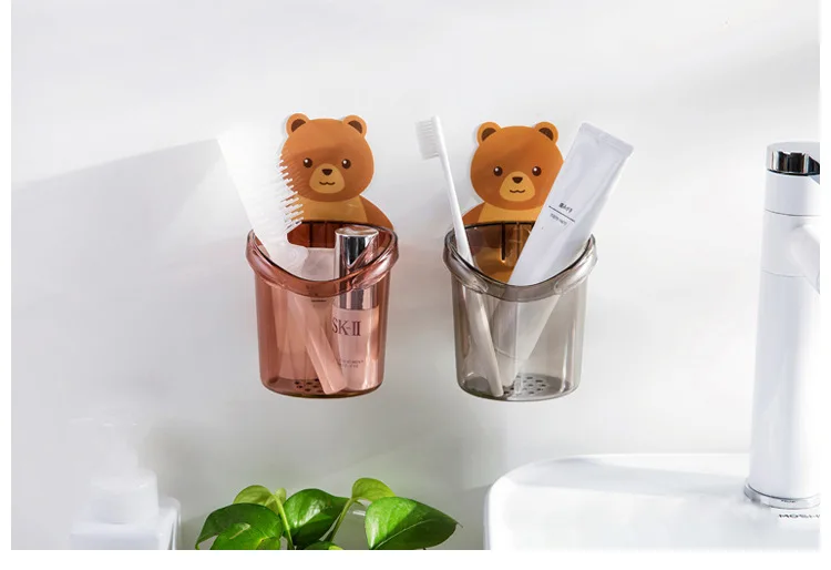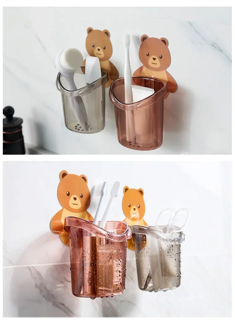 New Toothbrush Holder Adorable Bear Hug Storage Cup Wall-mounted Drain Design Easy Organization Toothbrush Cup Bathroom Supplies